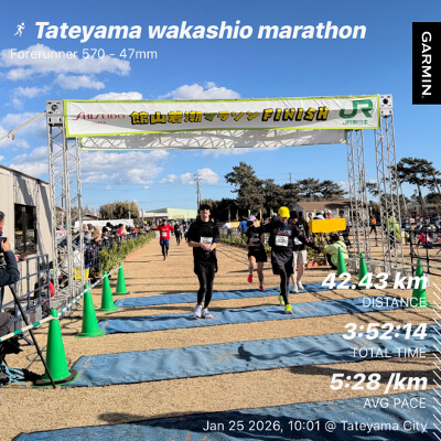 今回は館山若潮マラソンに参加しました。昨年の水戸黄門漫遊マラソンは家庭の事情でDNSとなったため、フルマラソンへの参戦は昨年の館山若潮マラソン以来となります。