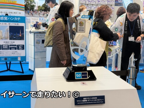 受付を済ませた後は、東京マラソンEXPO 2026の会場で様々な会社の展示を見学しました。こちらは優勝者に渡される実際のトロフィーです。